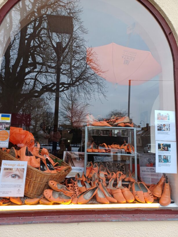 November 25 – December 10: The shop window at Flickans städ (on Storgatan opposite Stadsparken) is decorated in orange and with orange shoes. The shoes symbolize the 104 police reports regarding violence against women in the municipalities of Båstad and Ängelholm during 2024. (See image above.)